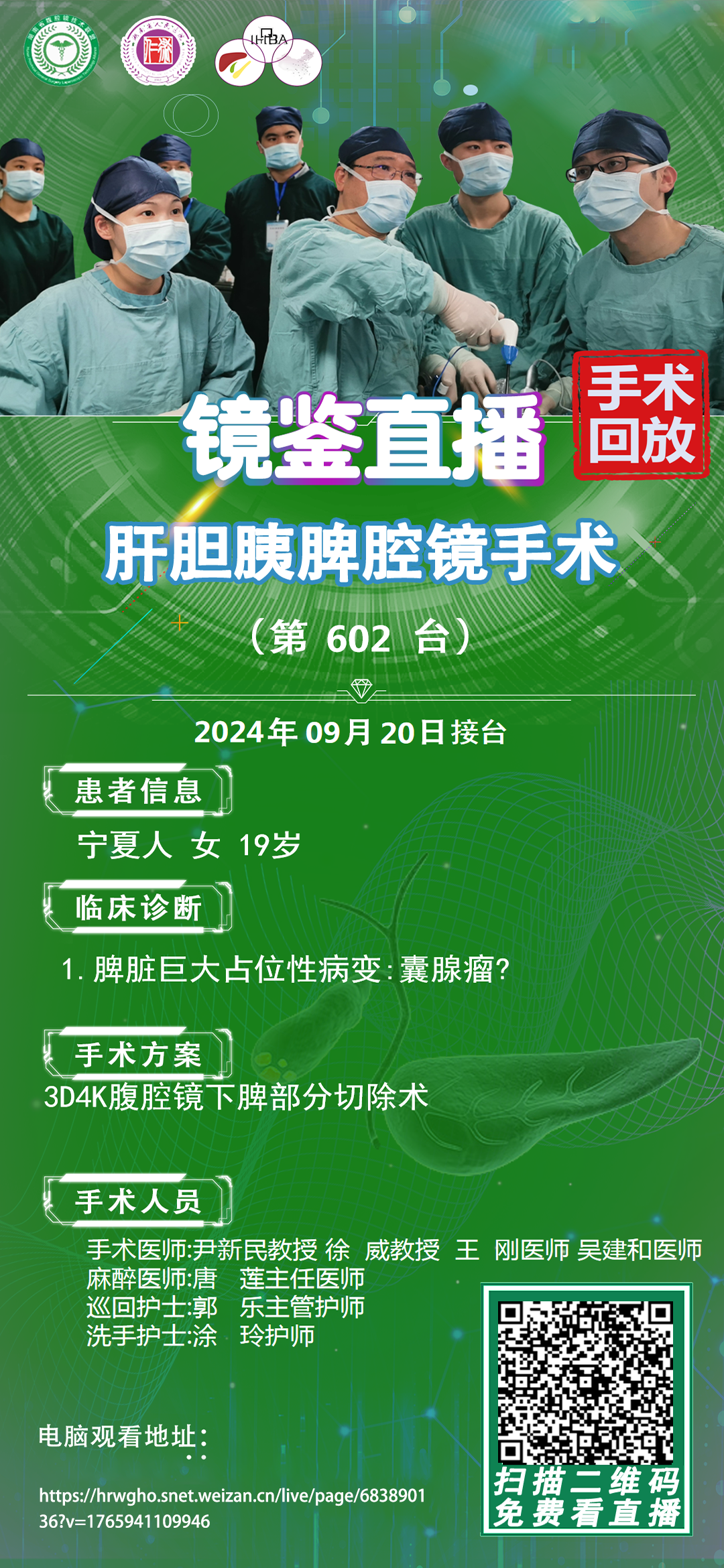 尹新民教授团队-镜鉴直播肝胆胰脾腔镜手术-第602台|脾脏巨大占位性病变,囊腺瘤?|3D4K腹腔镜下脾部分切除术|20240920
