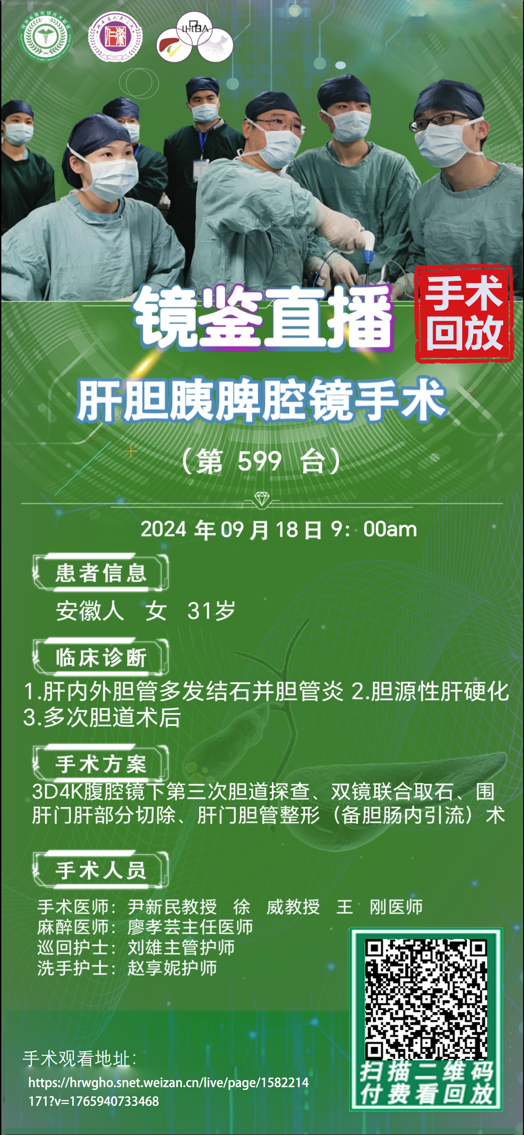 尹新民教授团队-镜鉴直播肝胆胰脾腔镜手术-第599台|1.肝内外胆管多发结石并胆管炎等|3D4K腹腔镜下第三次胆道探查、双镜联合取石、围肝门肝部分切除、肝门胆管整形(备胆肠内引流)术|20240918