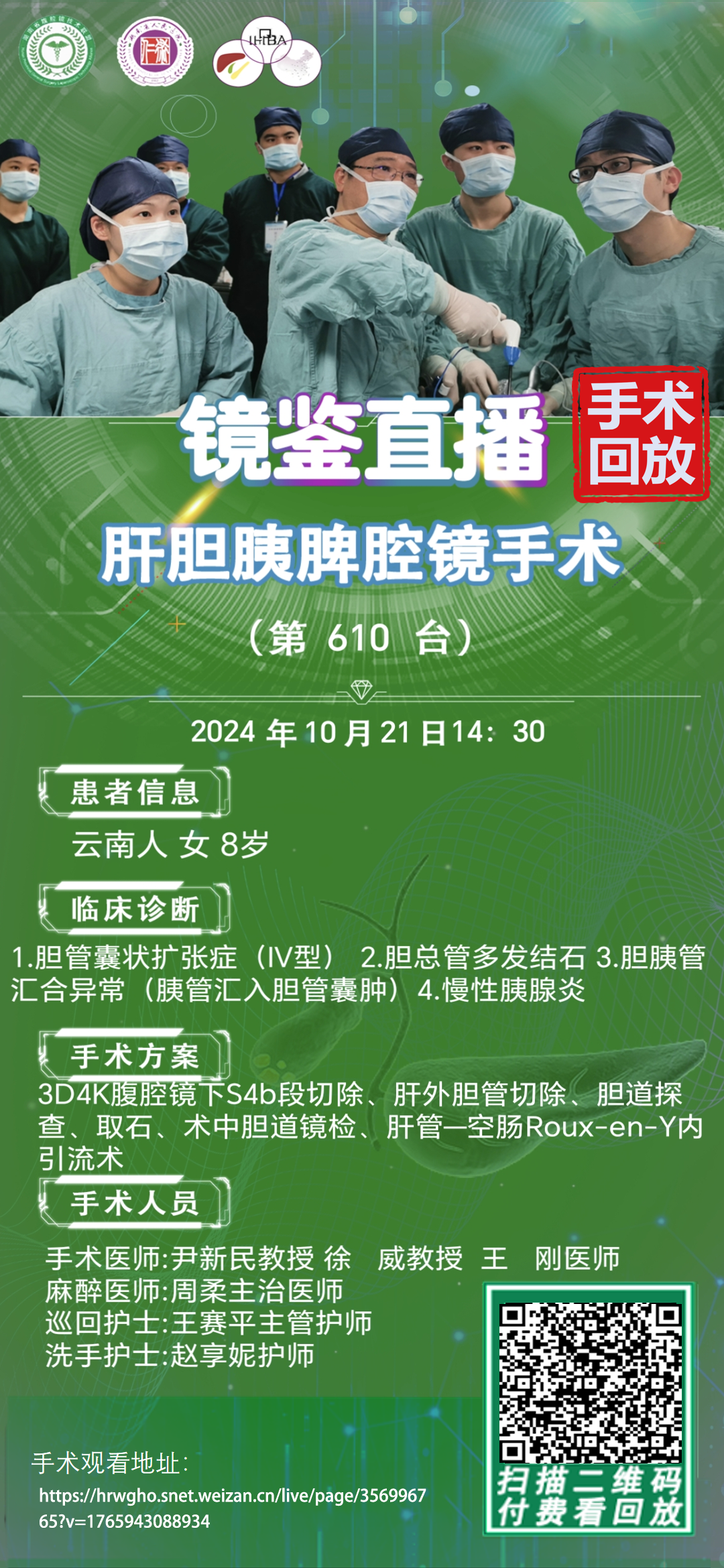 尹新民教授团队-镜鉴直播肝胆胰脾腔镜手术-第610台|3D4K腹腔镜下S4b段切除、肝外胆管切除、胆道探查、取石、术中胆道镜检、肝管一空肠Roux-en-Y内引流术|20241021