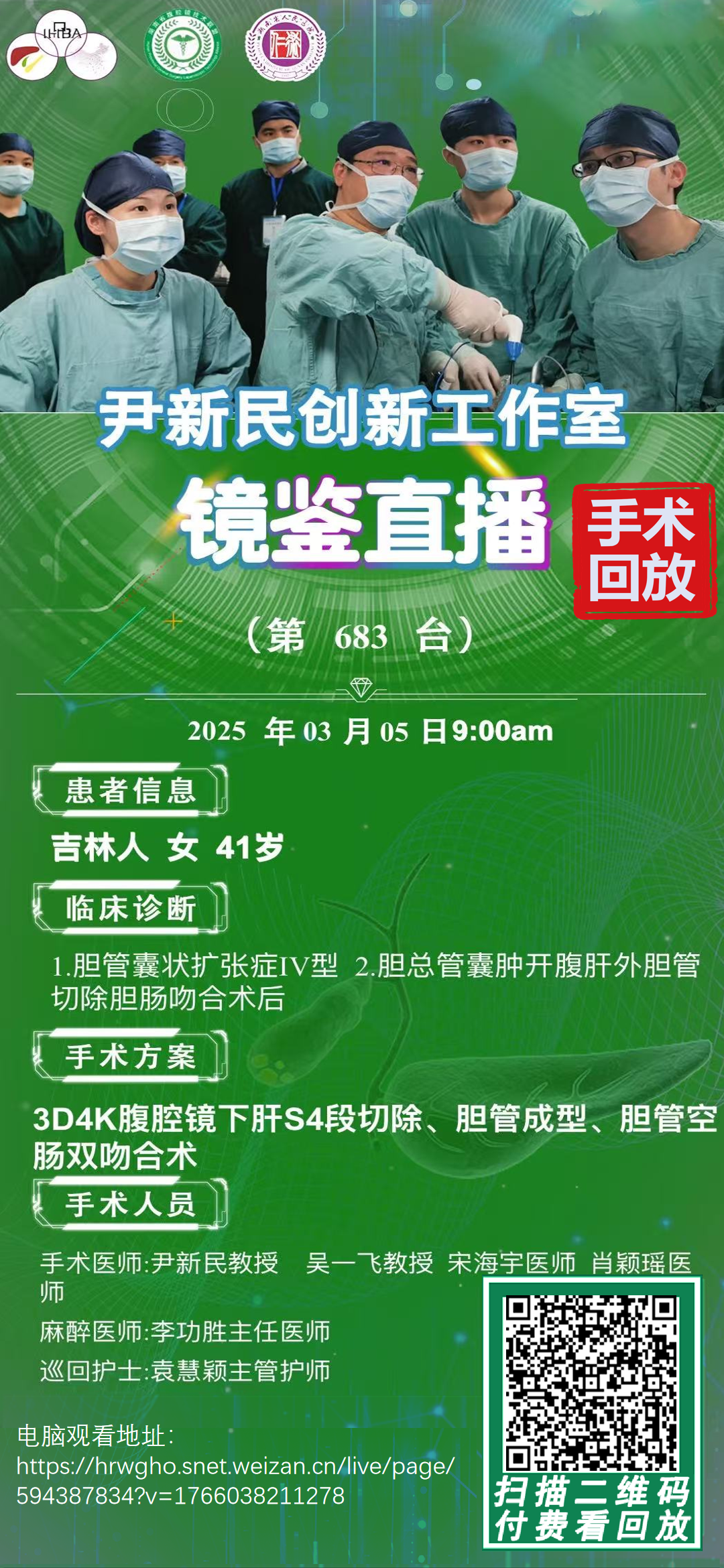尹新民劳模创新团队镜鉴直播-第683台|3D4K腹腔镜肝S4段切除、胆管成型、胆管空肠双吻合术|1.胆管囊状扩张症IV型 2.胆总管囊肿开腹肝外胆管切除胆肠吻合术后|20250305