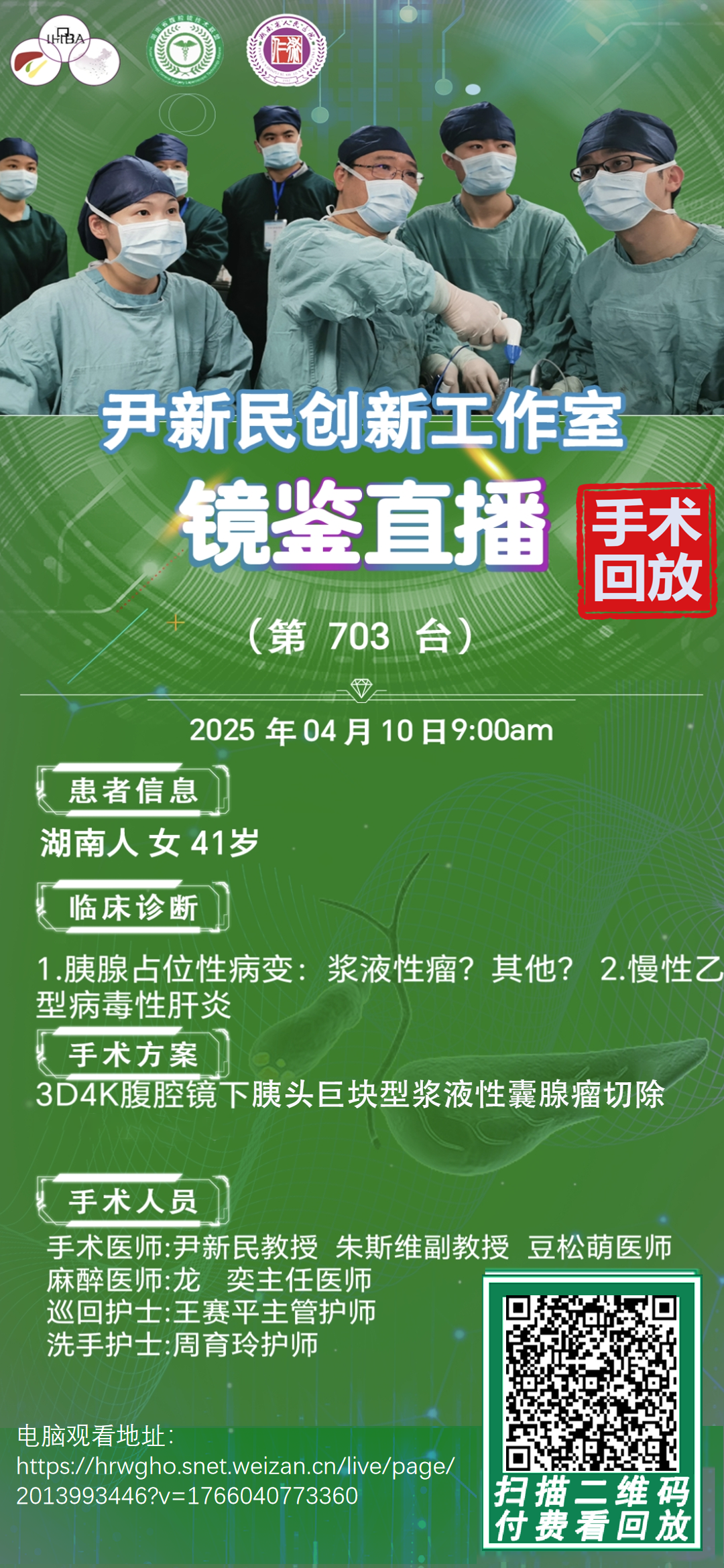 尹新民劳模创新团队镜鉴直播-第703台|3D4K腹腔镜下保留十二指肠胰头切除术|1.胰腺占位性病变:浆液腺瘤?其他?2.慢性乙型病毒型肝炎|20250410