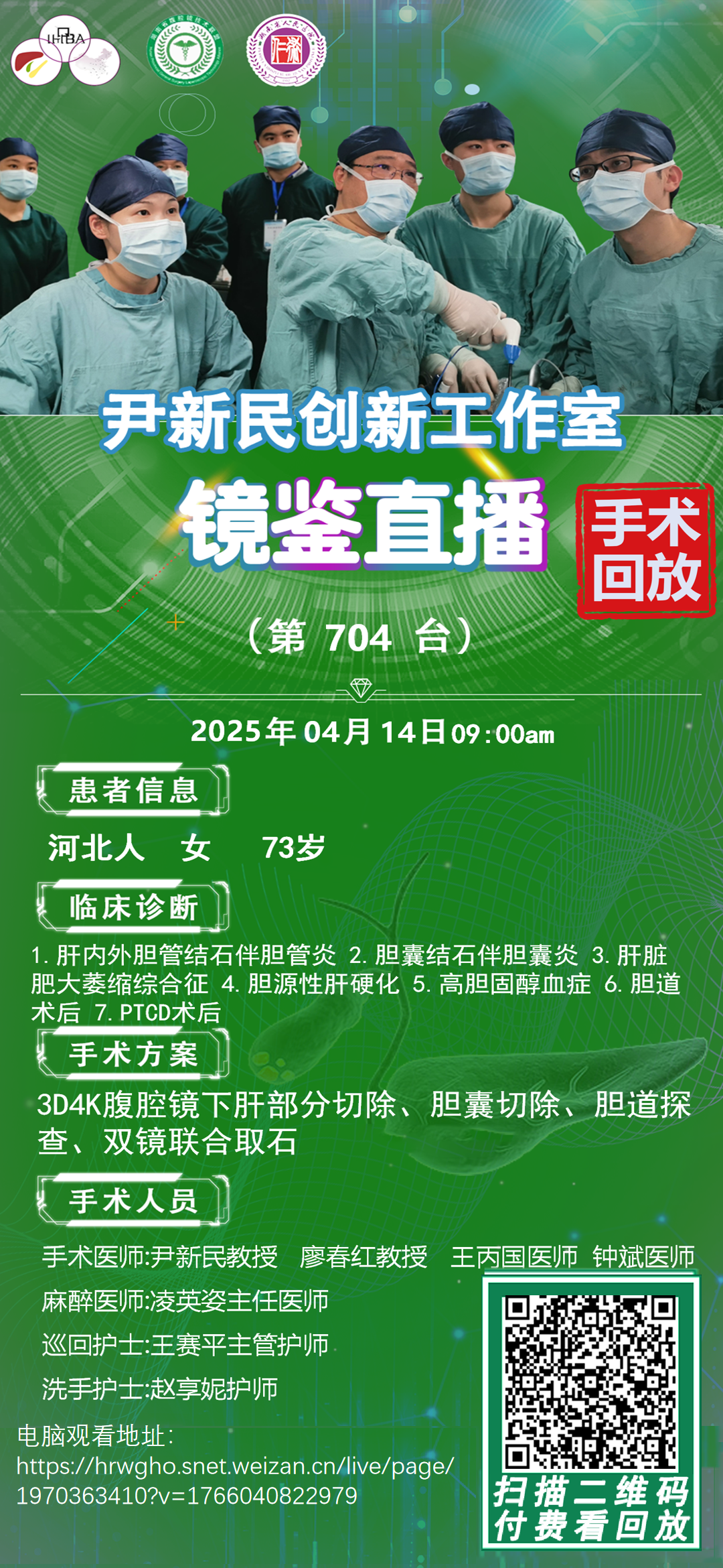 尹新民劳模创新团队镜鉴直播-第704台|3D4K腹腔镜下肝部分切除、胆囊切除、胆道探查、双镜联合取石、胆肠内引流术|1.肝内外胆管结石伴胆管炎 2.胆囊结石伴胆囊炎|20250414