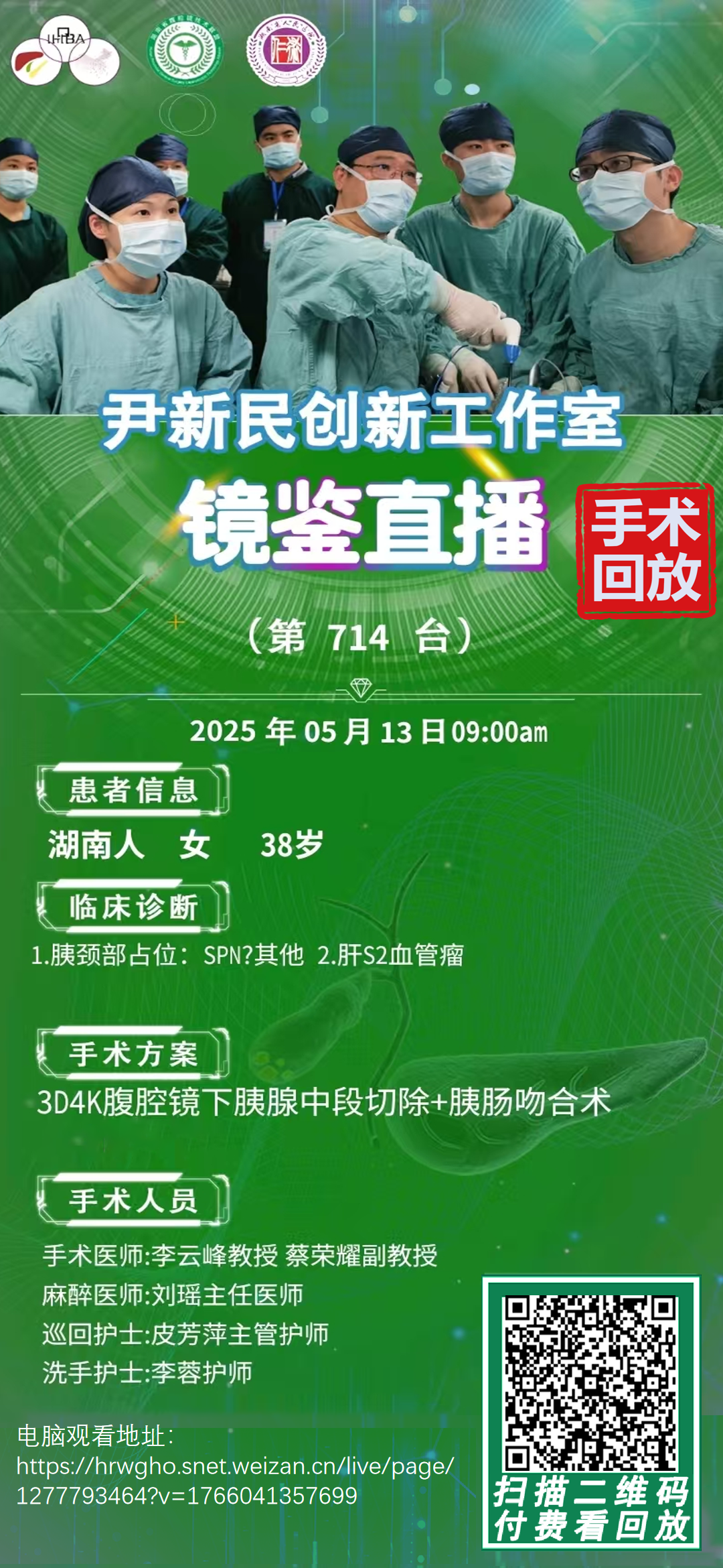 尹新民劳模创新团队镜鉴直播-第714台|3D4K腹腔镜下胰腺中段切除+胰肠吻合术|1.胰颈部占位:SPN?其他 2.肝S2血管瘤|20250513