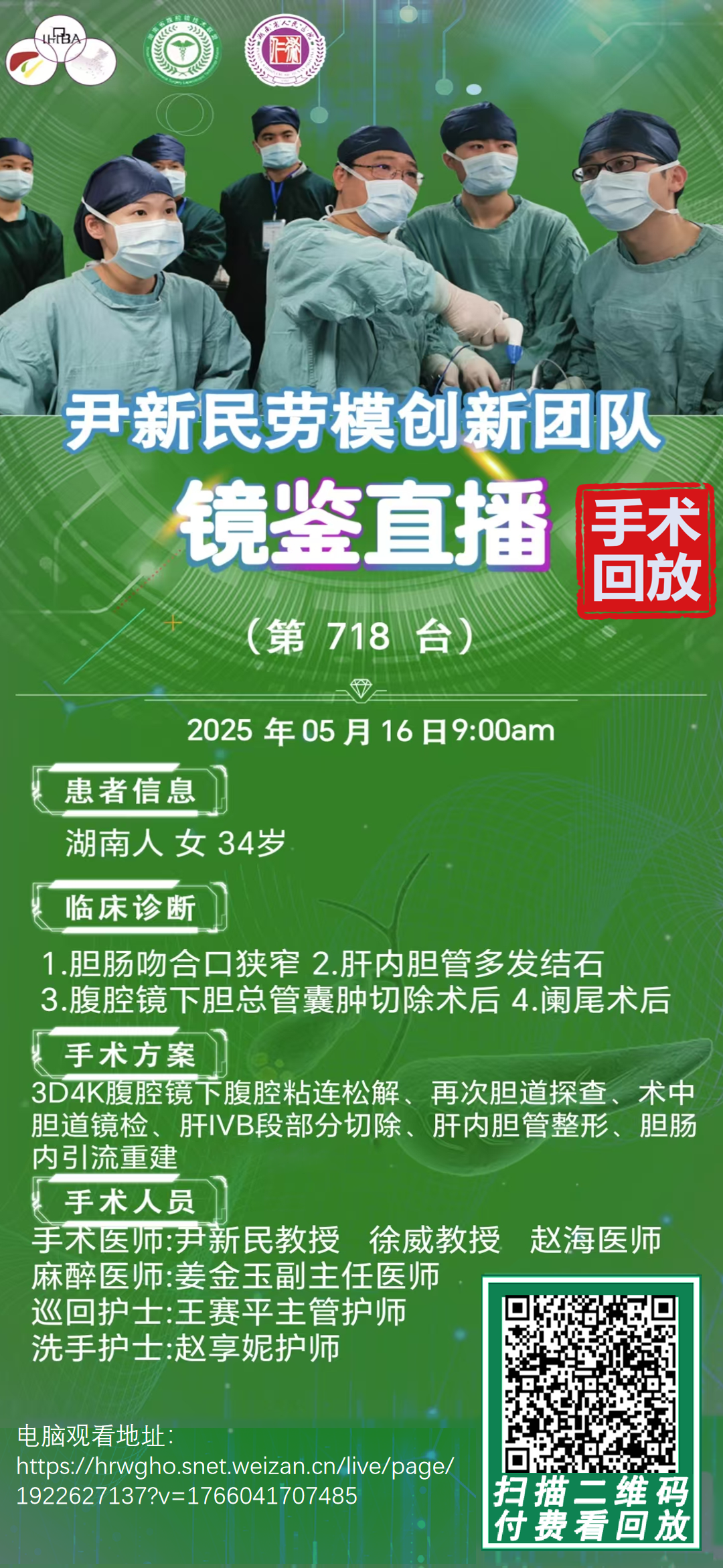 尹新民劳模创新团队镜鉴直播-第718台|3D4K腹腔镜下腹腔镜下腹腔粘连松解、再次胆道探查、术中胆道镜检、肝IVB段部分切除、肝内胆管整形、胆肠内引流重建|胆肠吻合口狭窄|20250516