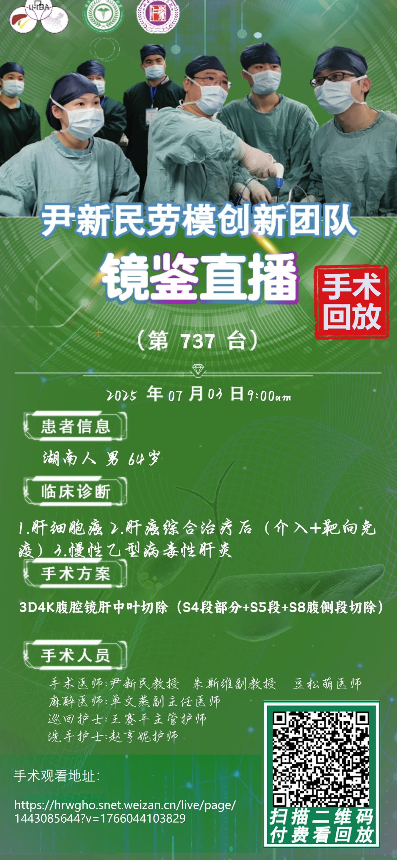 尹新民劳模创新团队镜鉴直播-第737台|腹腔镜下肝中叶切除(S5/S8及S4段切除)+胆囊切除手术|1.肝细胞癌 2.肝癌综合治疗后(介入+靶向免疫)3.慢性乙型病毒性肝炎|20250703