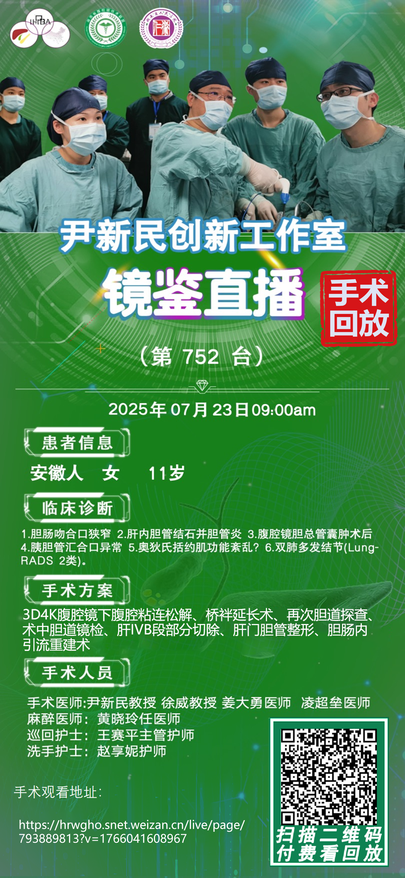 尹新民劳模创新团队镜鉴直播-第753台|3D4K腹腔镜下腹腔粘连松解、再次胆道探查、术中胆道镜检、肝门胆管整形手术|1.肝内外胆管多发结石并胆管炎 2.胆源性肝硬化|20250724