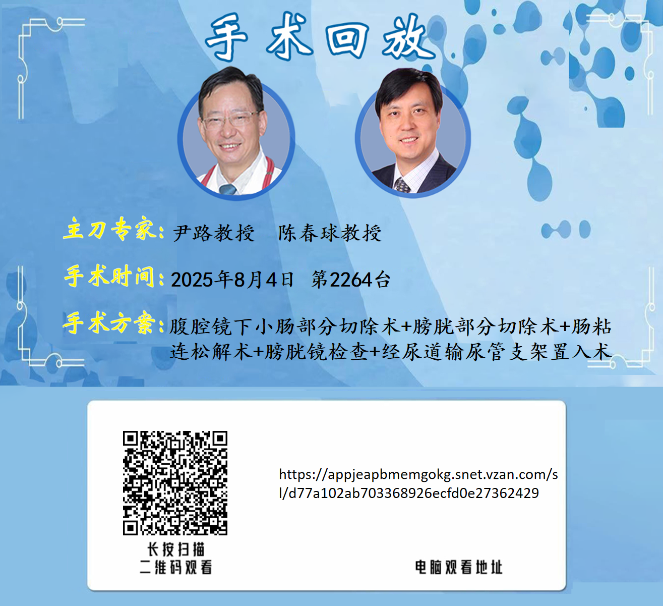 尹路教授团队第2264台|腹腔镜下小肠部分切除术+膀胱部分切除术+肠粘连松解术+膀胱镜检查+经尿道输尿管支架置入术|小肠膀胱瘘 膀胱出血 放射性肠炎 放射性膀胱炎|20250804