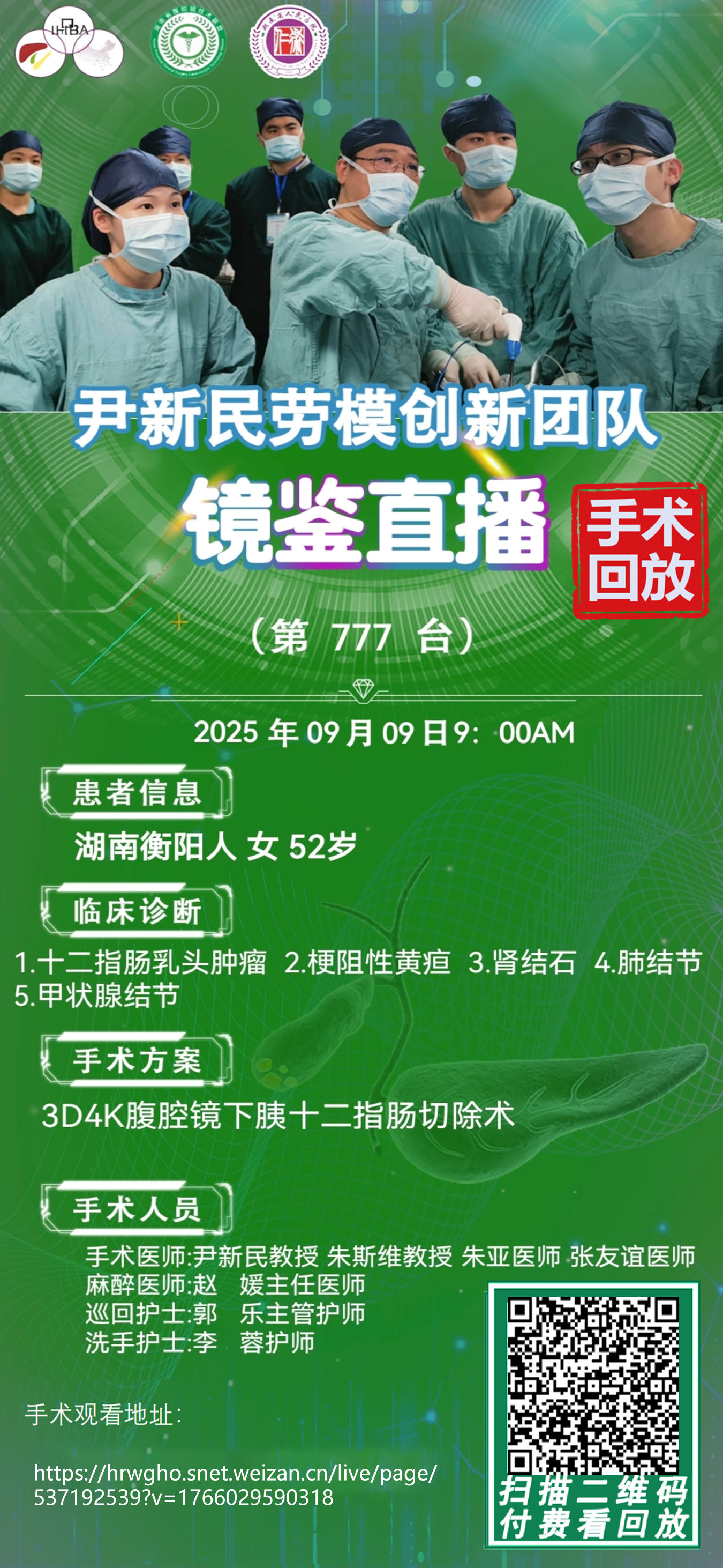 尹新民劳模创新团队镜鉴直播-第777台|3D4K腹腔镜下胰十二指肠切除术|1.十二指肠乳头肿瘤 2.梗阻性黄疸 3.肾结石 4.肺结节 5.甲状腺结节|20250909