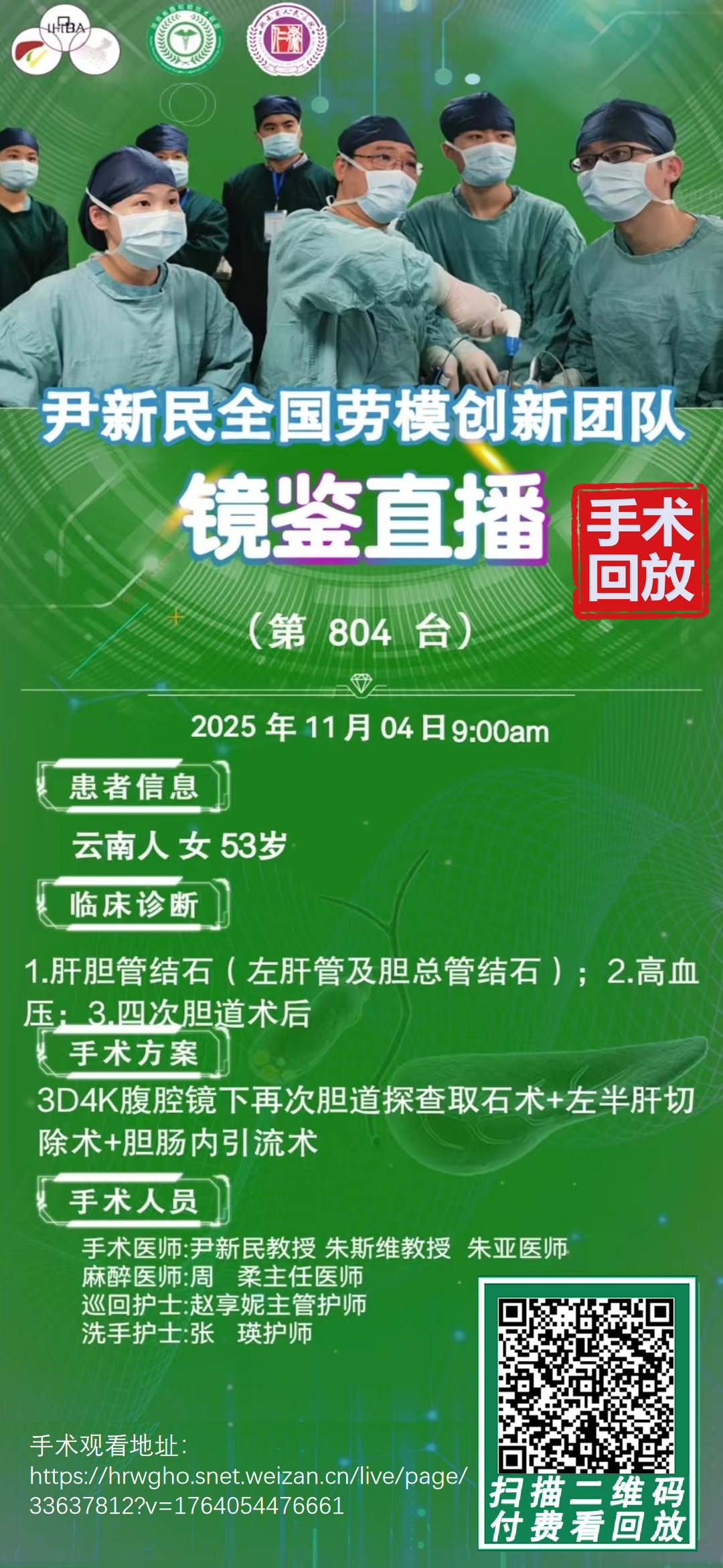 尹新民劳模创新团队镜鉴直播-第804台|3D4K腹腔镜下再次胆道探查取石术+左半肝切除术+胆肠内引流术|1.肝胆管结石(左肝管及胆总管结石) 2.高血压 3.四次胆道术后|20251104