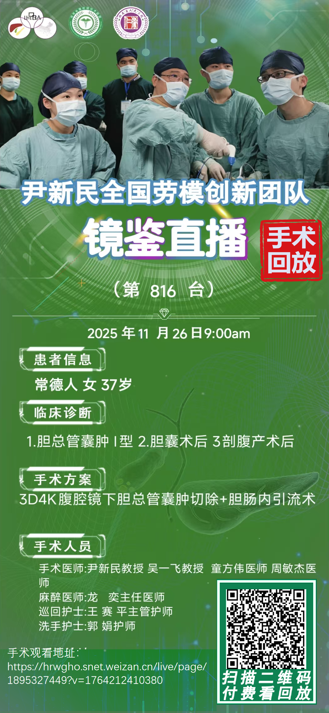 尹新民劳模创新团队镜鉴直播-第816台|3D4K腹腔镜下胆总管囊肿切除术+胆肠内引流术|1.胆总管囊肿 I型2.胆囊术后3.剖腹产术后|20251126