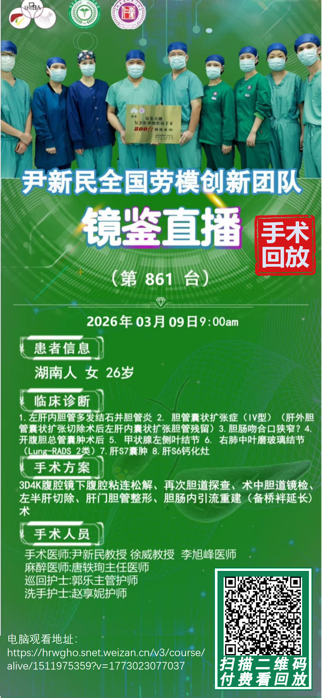 尹新民劳模创新团队镜鉴直播-第861台|3D4K腹腔镜下腹腔粘连松解、再次胆道探查、术中胆道镜检、左半肝切除、肝门胆管整形、胆肠内引流重建(备桥袢延长)术|1.左肝内胆管.. |20260309