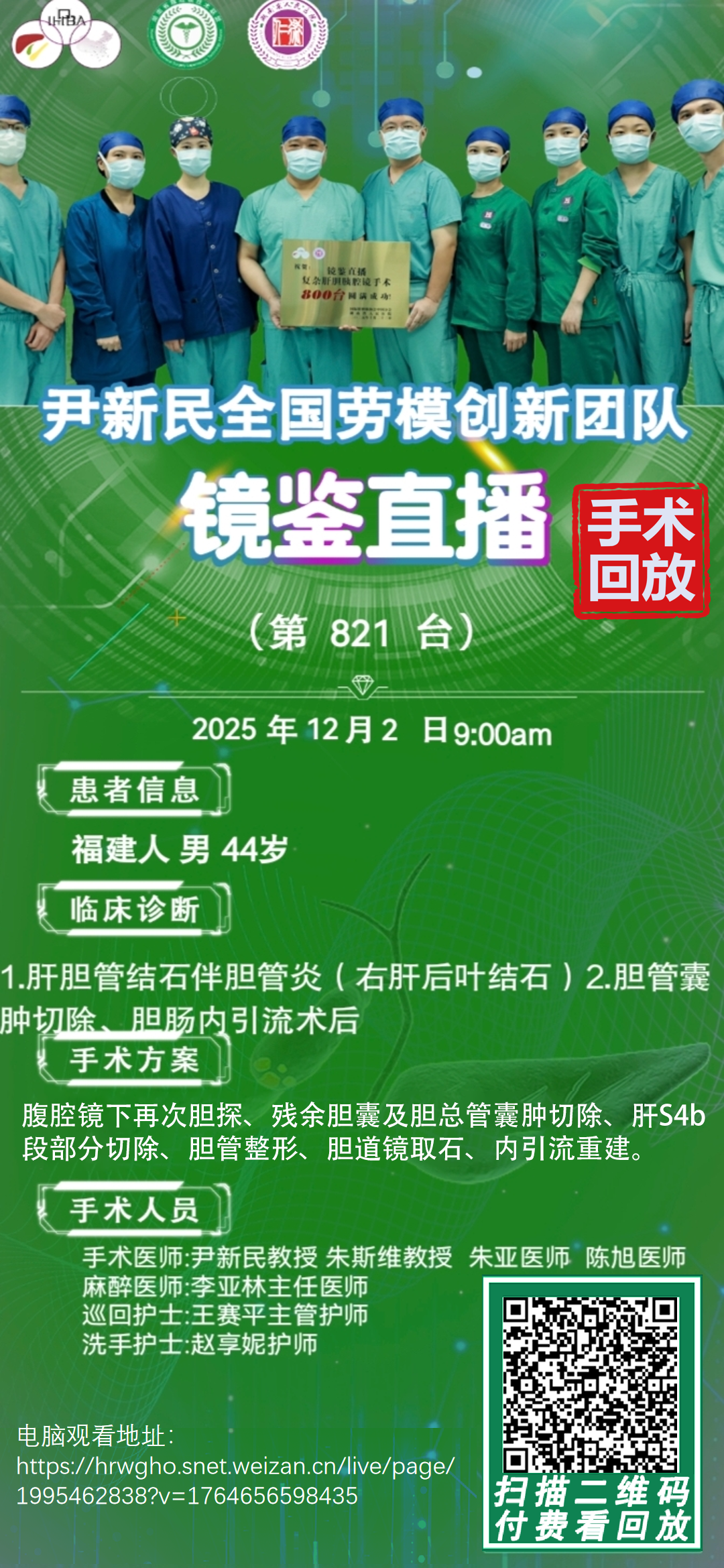 尹新民劳模创新团队镜鉴直播-第822台|全麻插管麻醉下进行{腹腔镜下腹腔粘连松解、再次胆道探查、术中胆道镜检、取石、围肝门肝实质部分切除、肝门胆管整形、胆肠内引流重建}术。||20251203