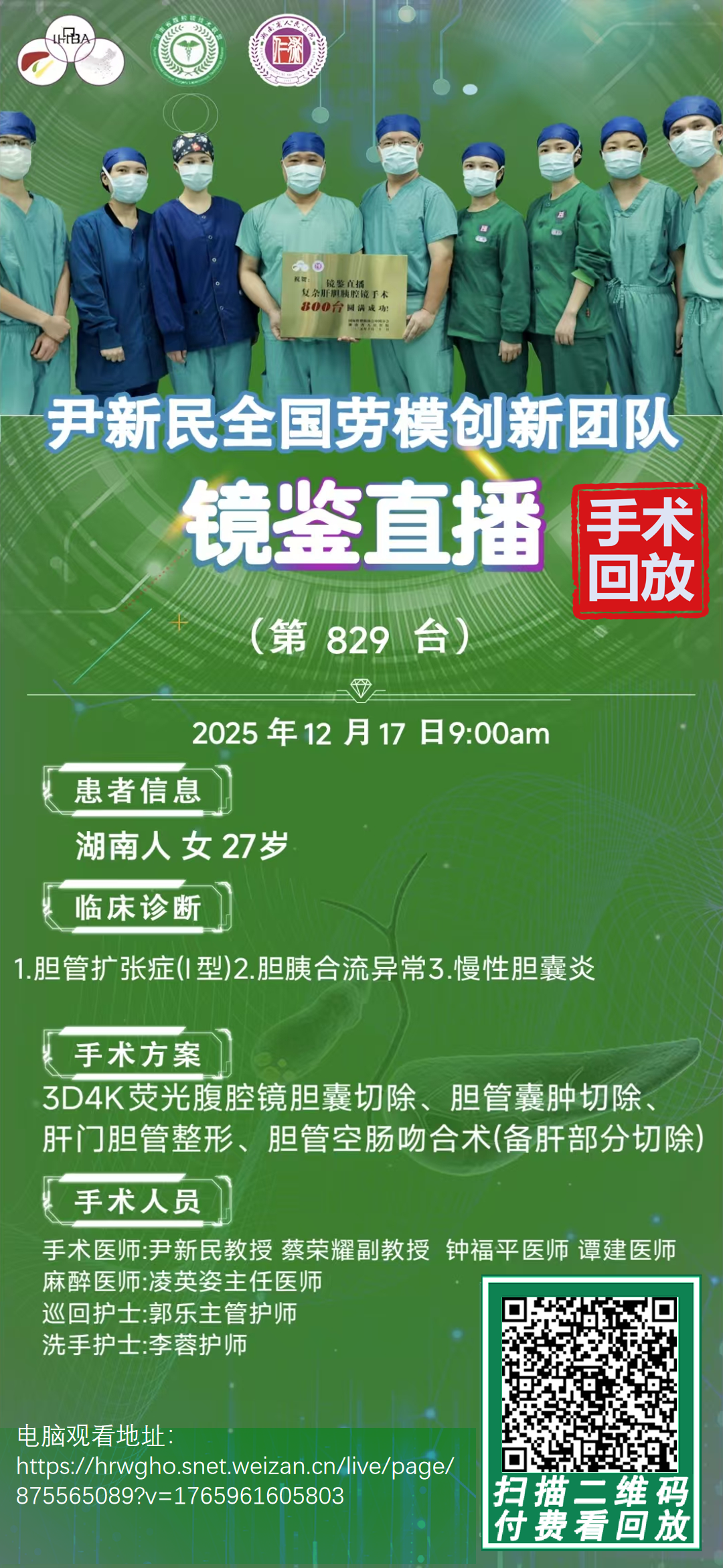 尹新民劳模创新团队镜鉴直播-第829台|3D4K荧光腹腔镜胆囊切除、胆管囊肿切除、肝门胆管整形、胆管空肠吻合术(备肝部分切除)|1.胆管扩张症(I型)2.胆胰合流异常3.慢性胆囊炎|20251217