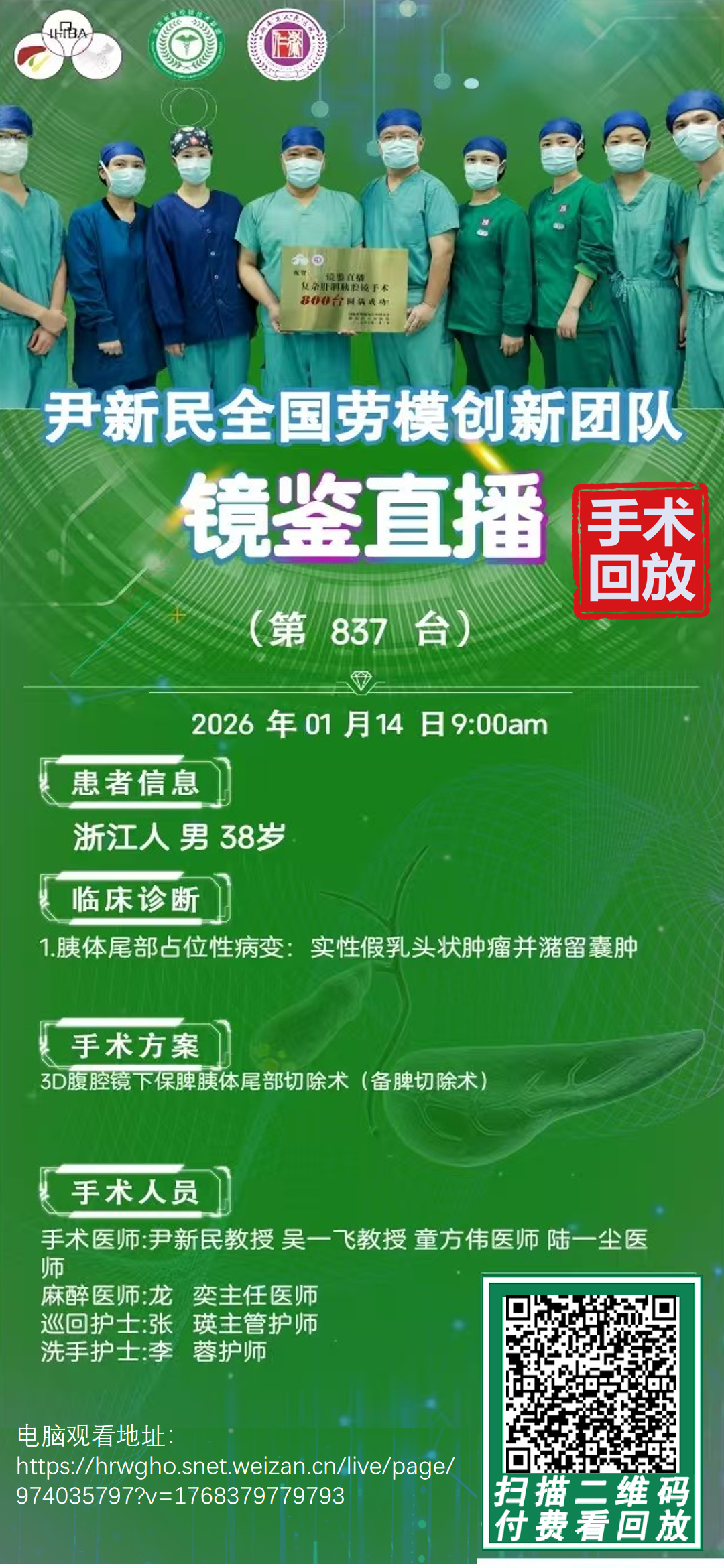 尹新民劳模创新团队镜鉴直播-第837台|3D腹腔镜下保脾胰体尾部切除术(备脾切除术)|1.胰体尾部占位性病变:实性假乳头状肿瘤并潴留囊肿|20260114