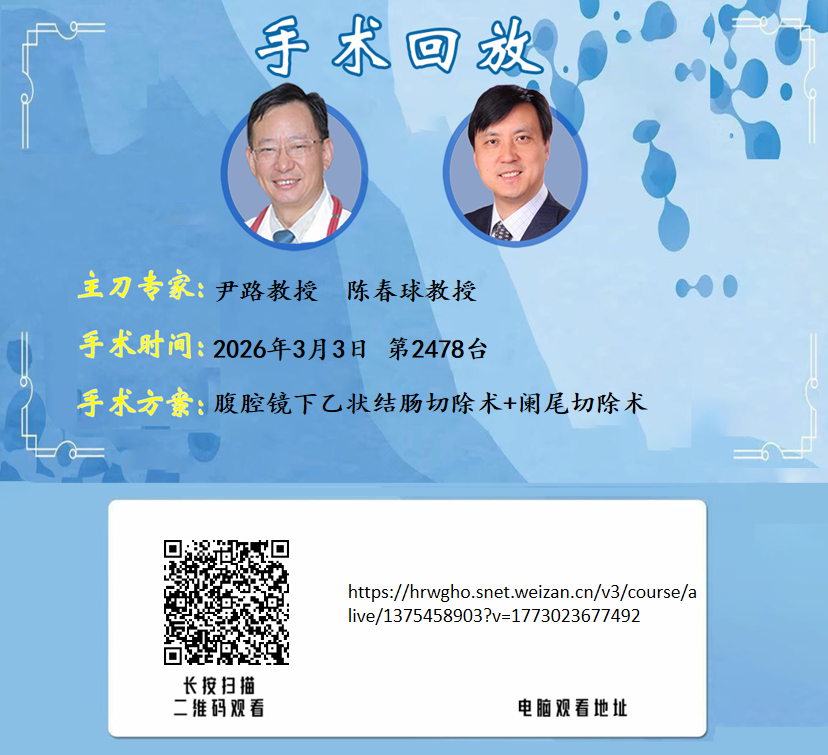 尹路教授团队第2477台 | 腹腔镜下小肠-结肠切除术+回肠造口回纳术+肠粘连松解术 |1、回肠造口状态 2、右半结肠切除术后 3、腹腔感染 |20260303