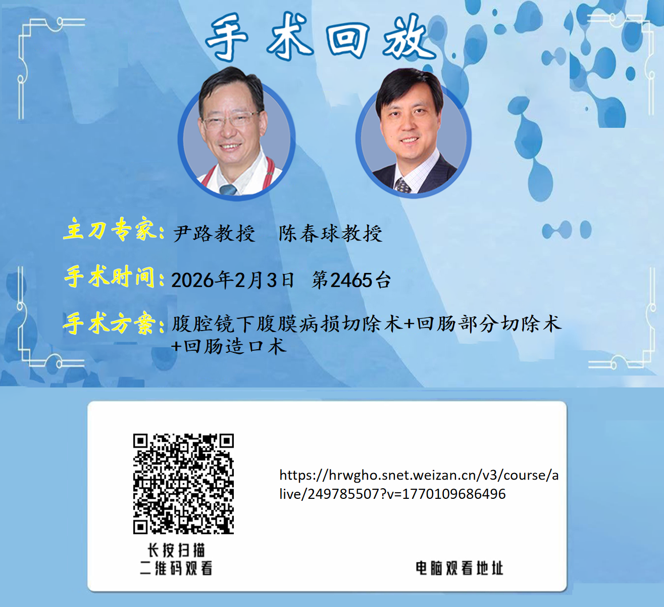 尹路教授团队第2465台 | 腹腔镜下腹膜病损切除术+回肠部分切除术+回肠造口术 | 1、手术后肠瘘2、肠穿孔个人史3、克罗恩病 |20260203