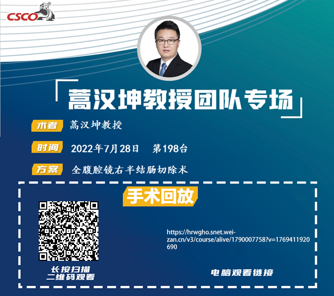 蒿汉坤教授团队第198台|全腹腔镜右半结肠切除术|升结肠癌;胆囊阑尾切除术后|20220728